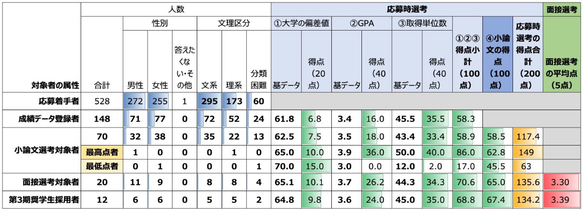 学奨財団は、透明性の高い運営を志向しており、具体的な選考基準を公開するだけでなく、前年の選考結果を情報公開し、応募者が応募しやすい環境を整備している。以下は、第3期の選考分析結果である。