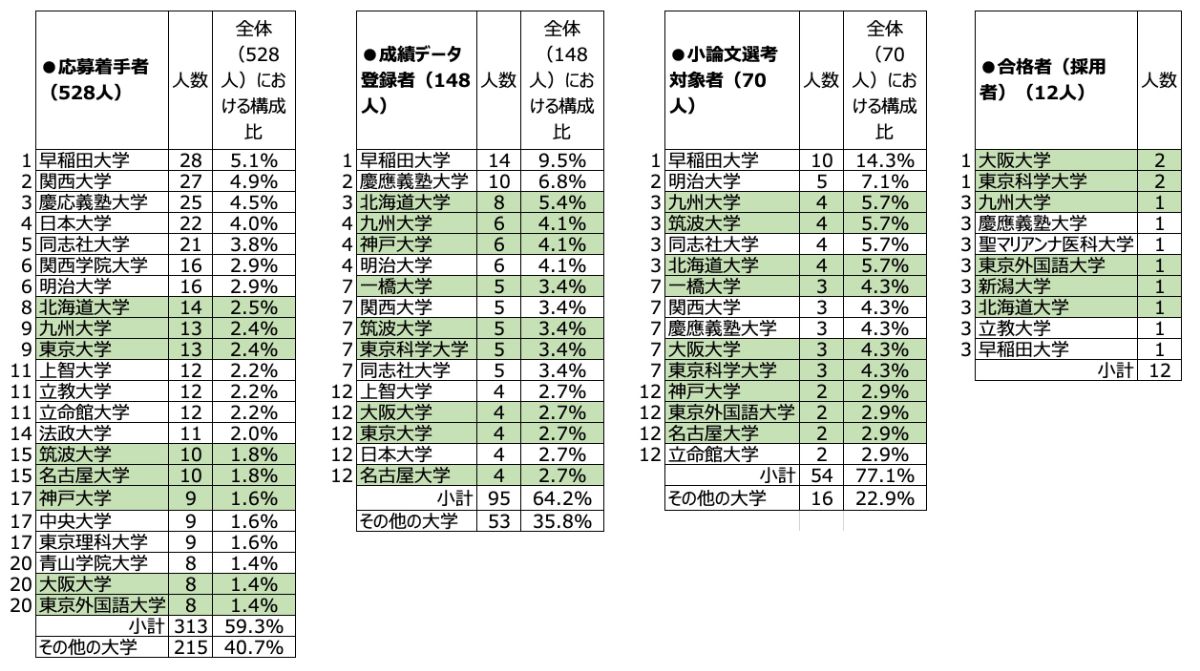 ただし、面接選考対象者20人と採用者12人の差はほとんどなく、面接選考での差が奨学生としての採否につながっている。